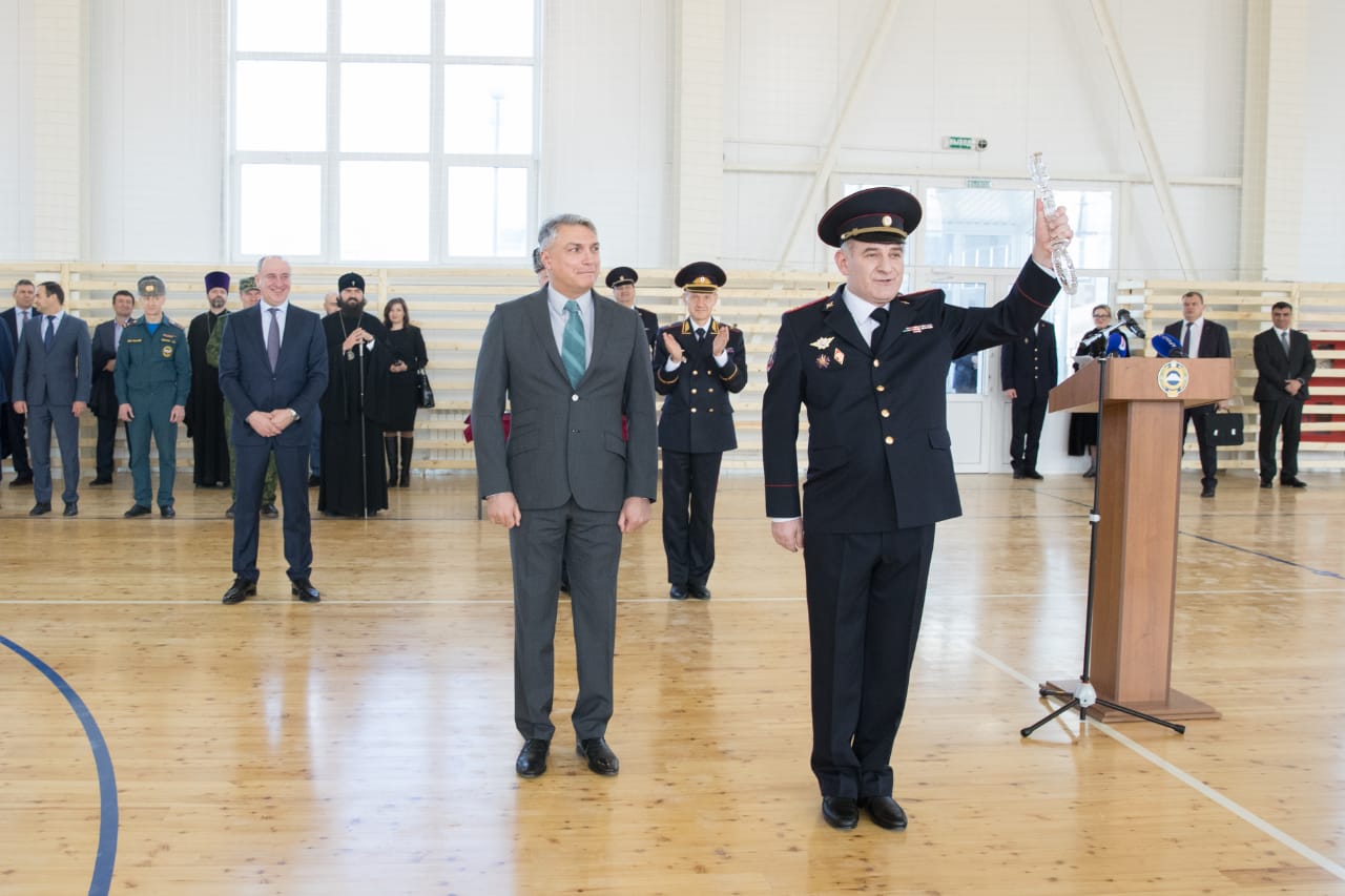 Он вручил символический ключ от нового служебного комплекса начальнику отдела МВД России по городу Черкесску полковнику полиции Ойдуру Эльканову.